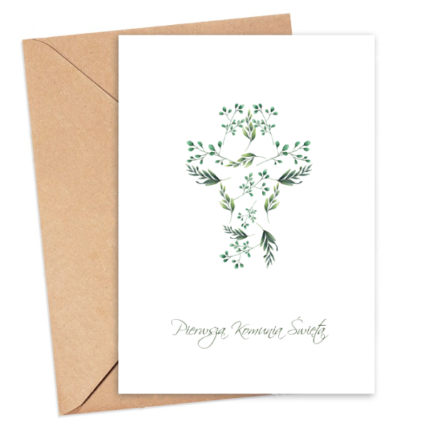 Kartka okolicznościowa – Pierwsza Komunia Święta zielony krzyż